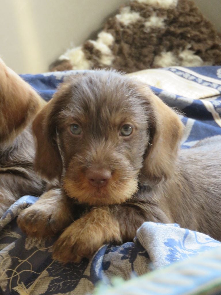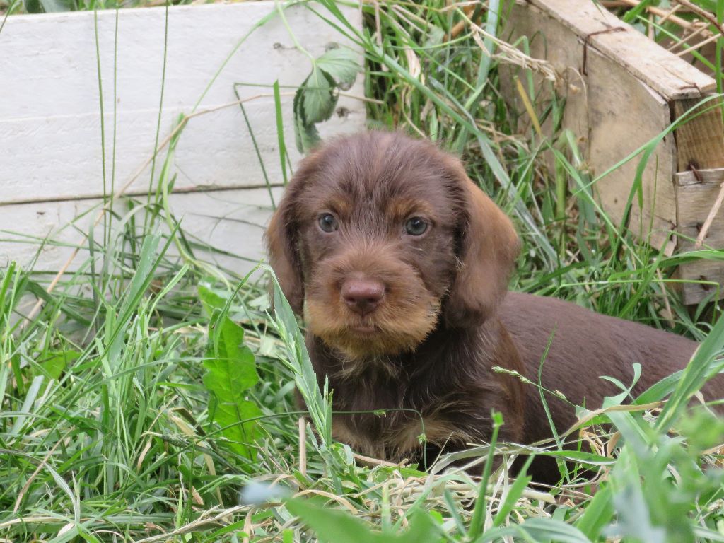 Très jolie chienne chocolat, affectueuse et avec du caractère !!! Elle restera dans la région chez un juge en exposition canine et chassera le lièvre.